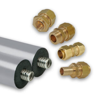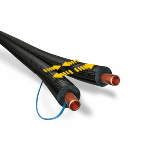Connexion dédiée pour la pompe à chaleur prête à l’emploi, Pour des diamètres DN25 et DN32, y compris les raccords rapides nécessaires pour connecter les tuyaux, Tuyaux annelés en acier inoxydable hautement flexibles, pratiques pour les espaces réduits sur le chantier, Isolation élastomère économique et efficace, Revêtement de protection contre les UV et les intempéries